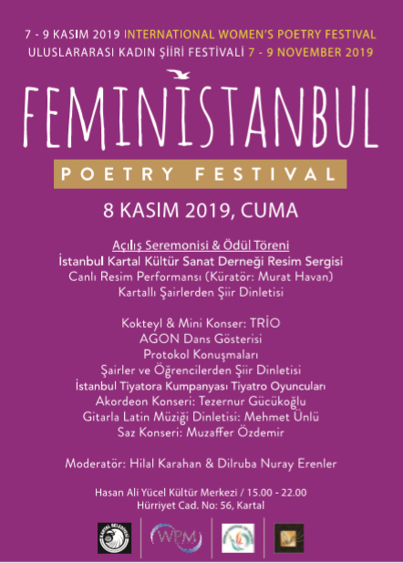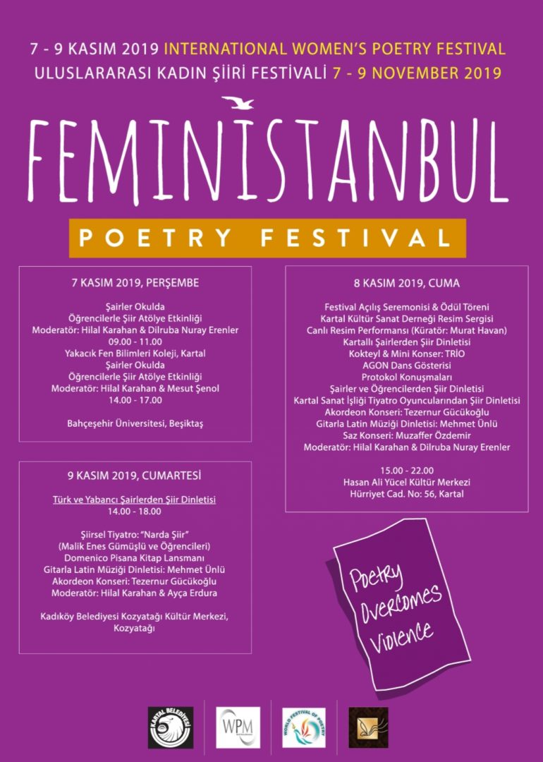 UNESCO’ya bağlı Uluslararası Şiir Organizasyonları içinde yer alan, “FeminİSTANBUL Kadın Şiiri Festivali” bu yıl dördüncü kez, 7-9 Kasım 2019’da, Kartal Belediyesi’nin desteğiyle düzenlenecek. “Şiir Şiddeti Yener” manifestosuyla yola çıkan FeminİSTANBUL, kadınlığın sorunlarına dair evrensel bir fikir, sanat ve diyalog platformu olmayı hedefliyor. Kadın temalı şiirleriyle her dilden, dinden ve cinsiyetten şair ‘şiddeti yenmek’ için bir araya gelecek.