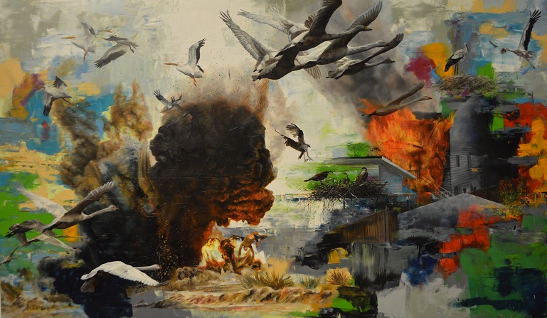 Sanatçı Huri Kiriş, insanın dünyayla/toprakla kurduğu mülkiyet ilişkisini ve bu çarpık ilişkinin başlattığı yıkımın şiddet döngüsünü ele aldığı resimlerini sanatseverlerin beğenisine sundu. Dünyanın evrendeki yerinden insanın dünyadaki yerine bakan, ancak bu makro ölçekten bakıldığında saçma sapanlığını ele veren insanlık durumunu güncel yıkım imgeleri üzerinden yeniden ve çarpıcı bir boyutta gösteren sergide, kentsel yaşam alanları, bu alanları insanlarla paylaşan hayvanlar, hayvanların kendi yaşam alanlarını yaratıcı biçimlerde dönüştürme ve şiddet döngüsünden çıkma becerisi de dokunaklı bir karşıt-imge olarak yer alıyor. Bu imgeler ve kompozisyonlar, izleyicide bu yıkımın etkileri üzerine farkındalık ve değişim vadediyor.